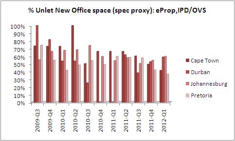 According to JLL nevertheless, investors are still conservative in committing to new speculative developments due to uncertainty, suggesting that speculative developments represent about 36% of the pipeline in the next 2 years. With all the committed construction activity in the Johannesburg area, office stock is expected to reach over 8,6 million m² in 2012 and 8.8 million m² in 2013.