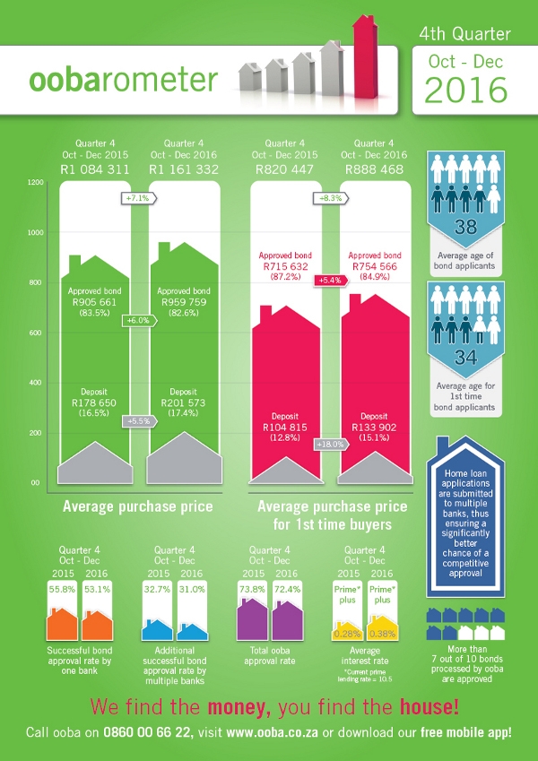The ooba statistics show that from the fourth quarter of 2015 (Q4) to Q4 of 2016 the Average Purchase Price indicated positive nominal growth of 7.1%. However, nominal quarter-on-quarter growth from Q3 to Q4 of 2016 confirms that growth in the property market has slowed significantly